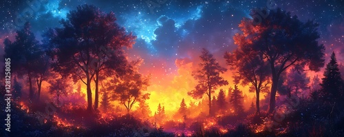Fototapeta premium A fiery forest ablaze under a starry night sky