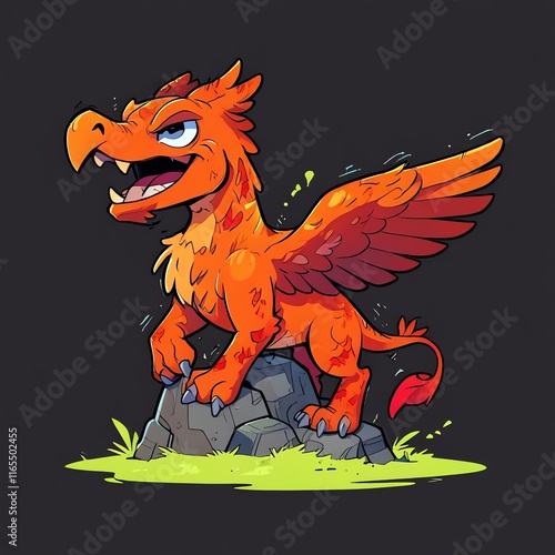 © SetCartoon, Naklejka premium A fiery griffon perched majestically on a rock, its wings spread wide, showcasing vibrant orange and red hues against a dark backdrop.