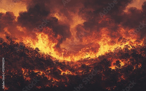 © Marina, Naklejka premium A fiery inferno consuming a hillside forest, with thick clouds of smoke billowing upward