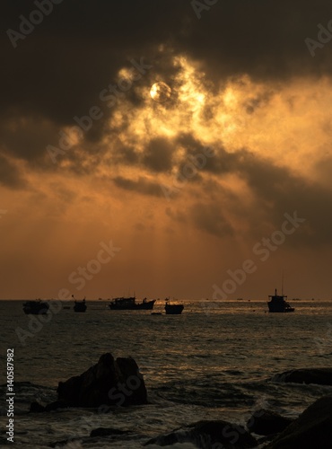 Fototapeta premium A fiery orange morning sky looking out over the south China sea in Vung Lam Bay Vietnam. With a rock covered coastline and fishing boat silhouettes.