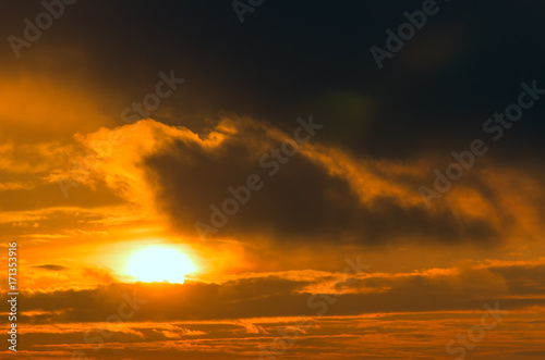 Obraz premium A fiery orange sunset, a great sun and a cloud of fire.