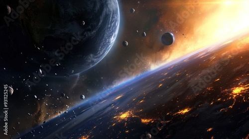 © Iswanto, Obraz premium A fiery planet with a glowing sun and asteroids in space.