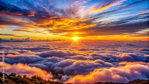 Fototapeta premium A fiery sunrise paints the sky above a sea of rolling clouds, casting a...