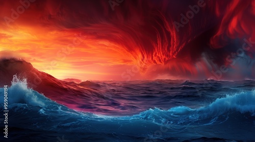 Fototapeta premium A fiery sunset casts brilliant orange and red hues across turbulent ocean...
