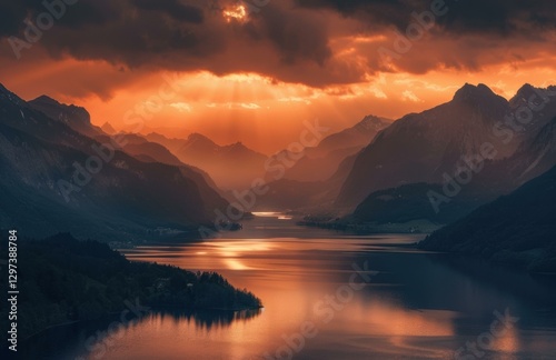 © Nikolay, Fototapeta premium A fiery sunset over a mountain lake. AI.