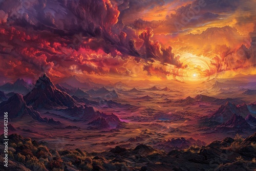 © boler, Fototapeta premium A Fiery Sunset over a Rugged Mountainous Landscape