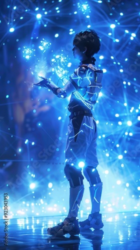 © Denisa, Fototapeta premium A figure engages with shimmering, luminous particles in a vibrant, futuristic environment