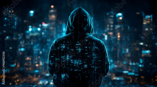 Fototapeta premium A figure in a hoodie gazes at a futuristic cityscape, surrounded by digital...