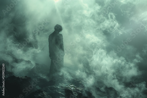 Fototapeta premium A figure standing in the dark fog. Scary ghost in dark mysterious forest