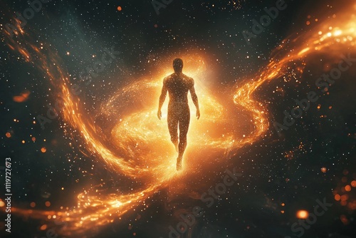 Fototapeta premium A figure stands in the center of an abstract cosmic background, radiating light and energy around the person