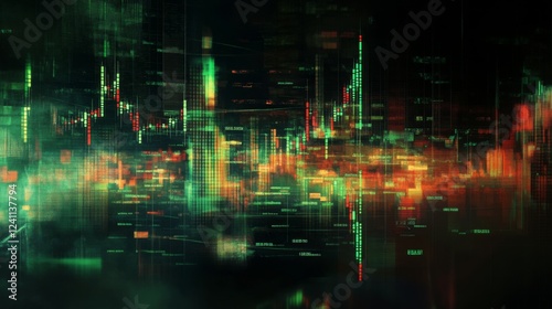 © Plaifah, Obraz premium A financial chart displaying stock market trends on a computer screen, with green and red candlesticks, highlighting a bullish market surge.