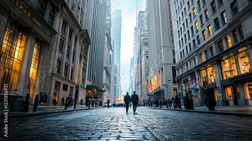 © Bunlong, Obraz premium A financial district with people walking in suits.