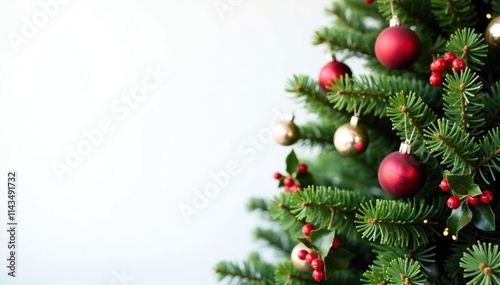 Fototapeta premium A fir tree with a white background, decorated with greenery, balls, and ornaments, holly berries, holiday decor, greenery