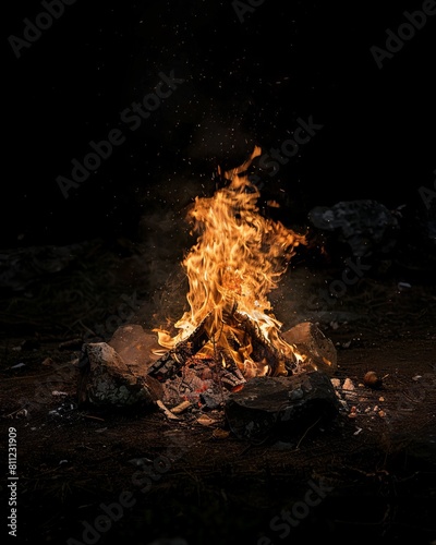 Naklejka premium A fire burning in the dark with rocks and a black background.