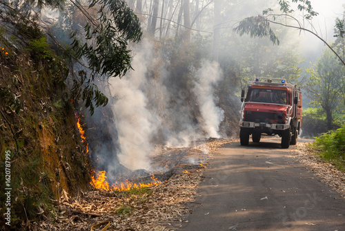© casavella, Fototapeta premium A fire engine is working to extinguish a forest fire in Galicia.