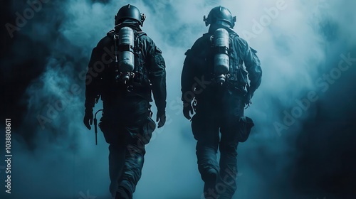 © Green Creator, Fototapeta premium A fire rescue team using a thermal camera to search for people in a smokefilled room, advanced firefighting technology concept