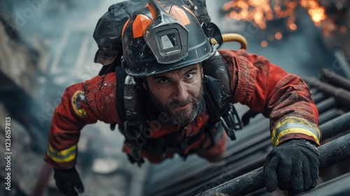 © Phongsri, Fototapeta premium A firefighter climbing a ladder during a rescue operation,