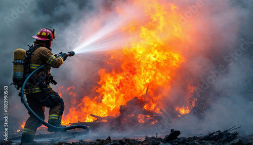 © abu, Obraz premium A firefighter combats a fierce blaze, water cutting through smoke and flames dynamically.