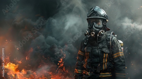 Fototapeta premium A Firefighter dressed in a uniform full gear, standing against the backdrop of smoke and flames. in a studio. fire safety concept.