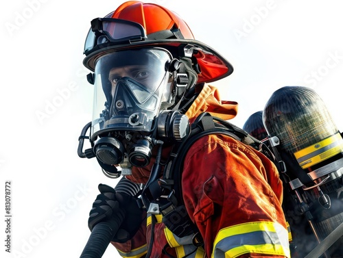 Naklejka premium A firefighter in full gear, helmet secured, amidst billowing smoke, bravely battling flames to rescue lives, embodying courage and protection in the face of danger