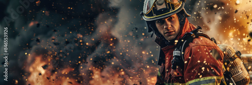 Fototapeta premium A firefighter in full gear stands amidst a raging fire, his determined gaze...