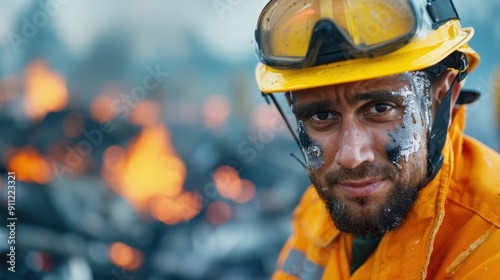 © DuangphonKPR, Fototapeta premium A firefighter, inspecting the aftermath of a blaze, looking for potential hazards