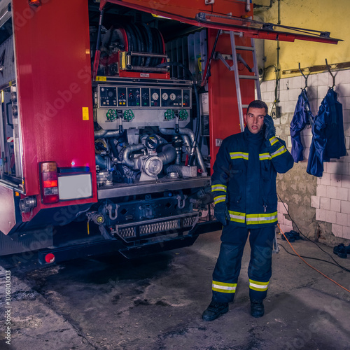 © qunica.com, Fototapeta premium A firefighter repairing the fire engine in the fire station