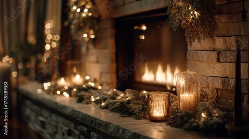 Fototapeta premium A fireplace with a mantle and a mantle with a Christmas tree
