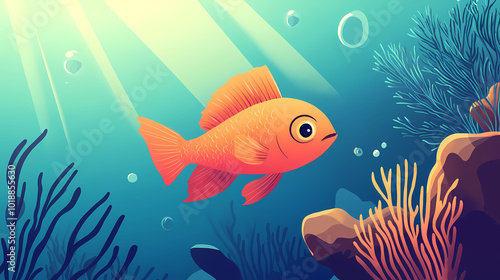 Naklejka premium A fish is swimming in the ocean with the sun shining on it. Coral Reef Lagoon. Illustration