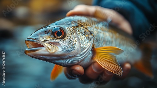 © Helois, Fototapeta premium A fisherman holds a freshly caught fish with a blurred background of a river.