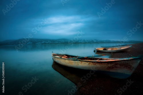 Naklejka premium A fishing boat among the reeds. Iznik Lake. Bursa.