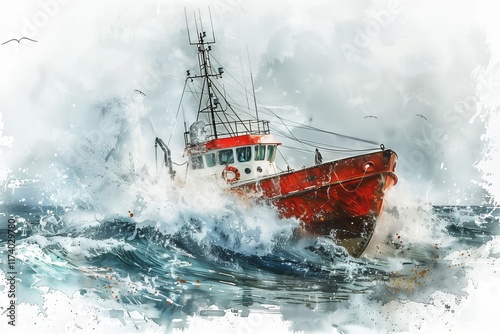 © S photographer, Naklejka premium A fishing boat battles turbulent waves, showcasing the power of nature in a dramatic maritime scene.