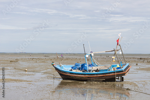 © thunyakon, Fototapeta premium a fishing boat lies at sundown in the fjord