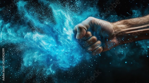 Fototapeta premium A fist connects with an invisible force, sending waves of blue powder...
