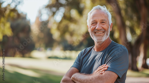 Obraz premium A fit elderly man does outdoor sports in the park on a sunny day, maintaining...
