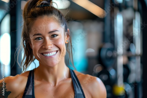 © Лена Шевчук, Fototapeta premium A fit muscular female personal trainer smiling at the camera in a gym, close up