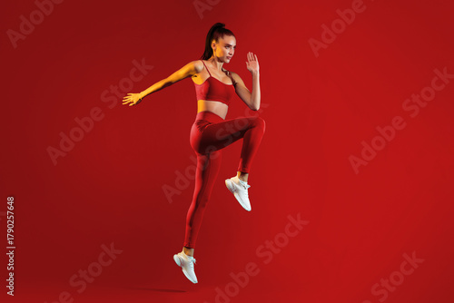 © Prostock-studio, Naklejka premium A fit woman is captured mid-jump in striking red activewear on a vivid red background, showcasing her dynamic movement and athleticism. The scene conveys energy and determination.
