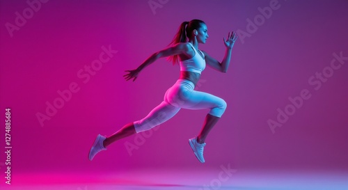Fototapeta premium A fit woman performing dynamic running motion, illuminated by vibrant pink...