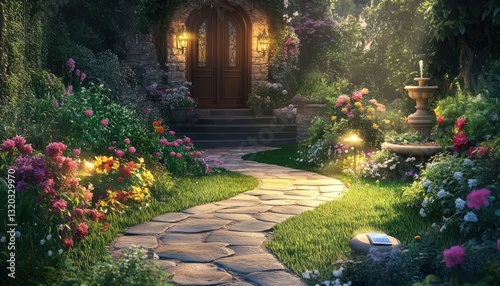 © NormanBalberan, Fototapeta premium A flagstone home pathway winds through a vibrant garden to the door 1. Generative AI
