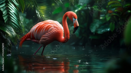 © Sirichat. Camphol, Fototapeta premium A flamingo wades in shallow water, a tropical summer atmosphere