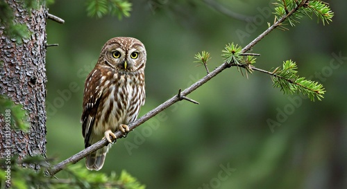 Obraz premium A Flammulated Owl Perched on a Thin Branch of a Conifer Tree in a...