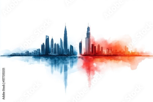 © Sanchai, Naklejka premium A flat 2D illustration of the Dubai Frame, with one side depicting the city historical past and the other its modern skyline on a clean white canvas