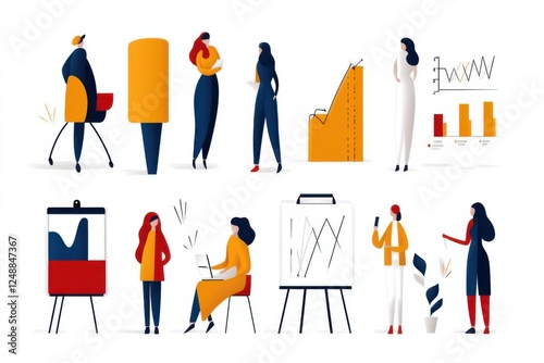 © Iona, Naklejka premium A flat design concept showcasing diverse teamwork, branding, and economic elements, vividly illustrating collaborative and strategic ideas.