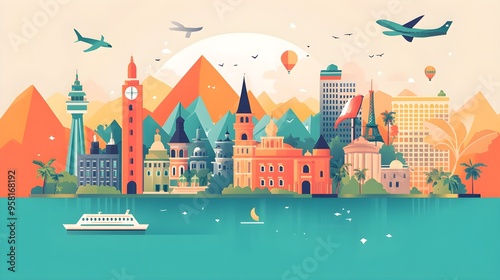 Fototapeta premium A flat design of a travel brochure with icons for transportation and...
