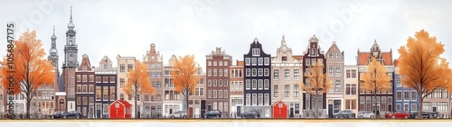 Naklejka premium A flat design of the cityscape of Amsterdam, with trees and buildings in shades of brown, beige, orange, yellow, gray, and blue, creating an autumnal atmosphere