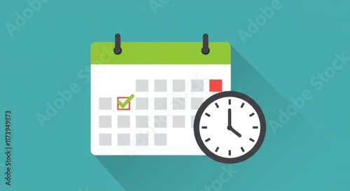 © PixelPulse Creative, Obraz premium A flat illustration of a calendar with a green header and a clock placed beside it