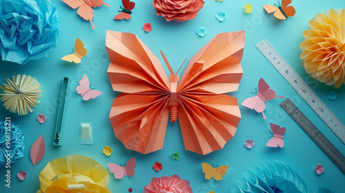 © Resonant Visions, Fototapeta premium A flat lay of a completed 3D tissue paper butterfly, with intricately folded wings creating a lifelike effect,