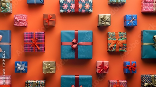 © Galib, Fototapeta premium A flat lay of colorful gift boxes with bows, arranged in a grid pattern against a orange background.
