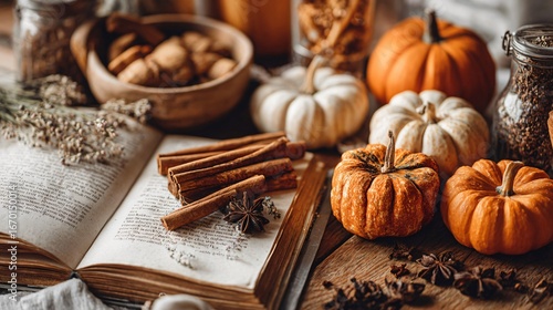 Fototapeta premium A flat lay with open recipe books, cinnamon sticks, and a mix of seasonal pumpkins