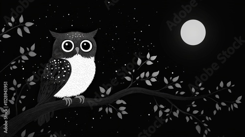 Fototapeta premium A flat minimalist illustration of an owl sitting on a tree branch at night, in black and white.
